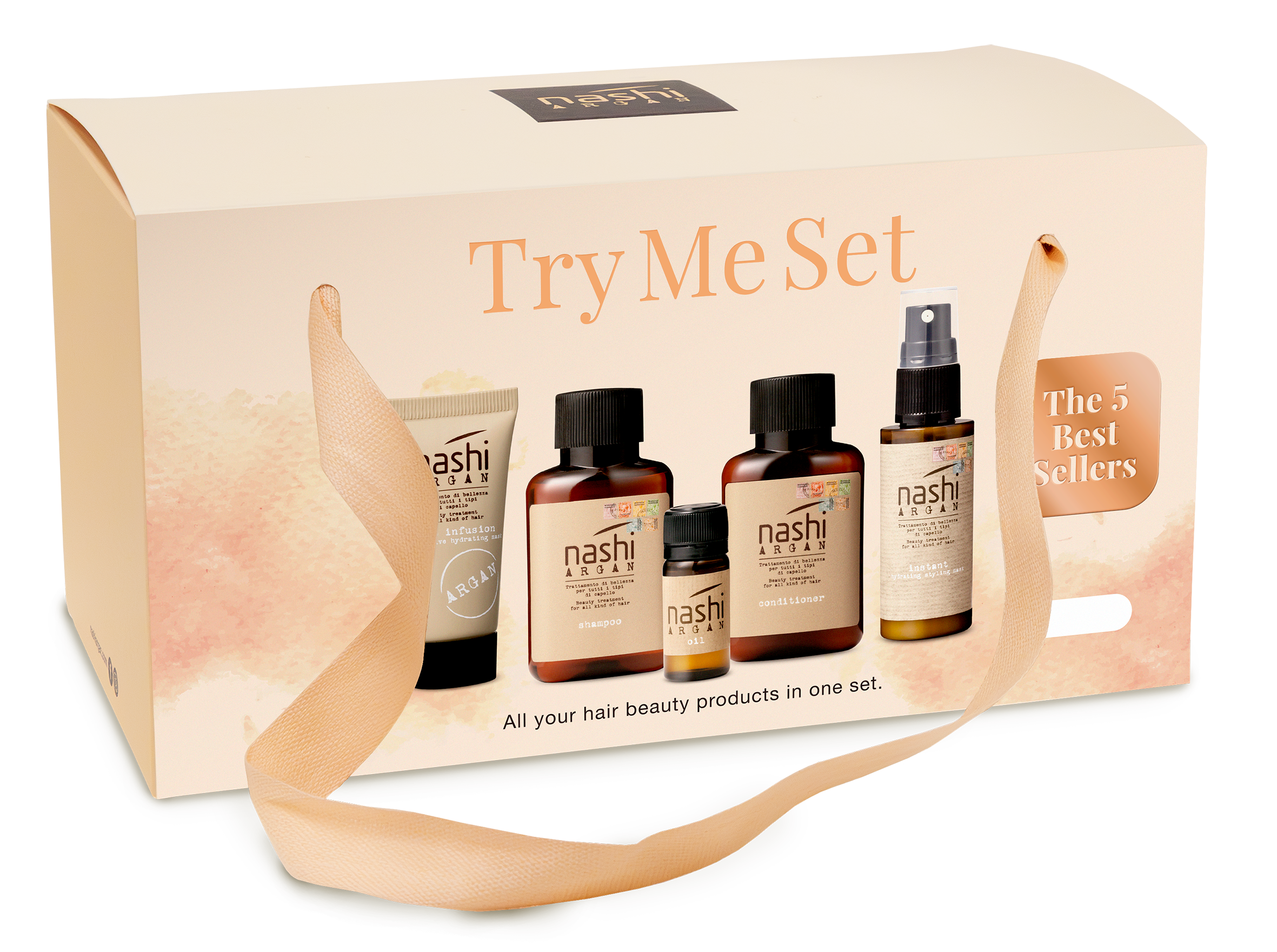 Try me Set je paket koji sadrži svih 5 esencijalnih proizvoda NASHI Argan u manjim pakiranjima kao kompletan tretman ljepote za vašu kosu. Pružite kosi kompletan doživljaj Nashi Argana uz nahranjenu, meku i vitalnu kosu !